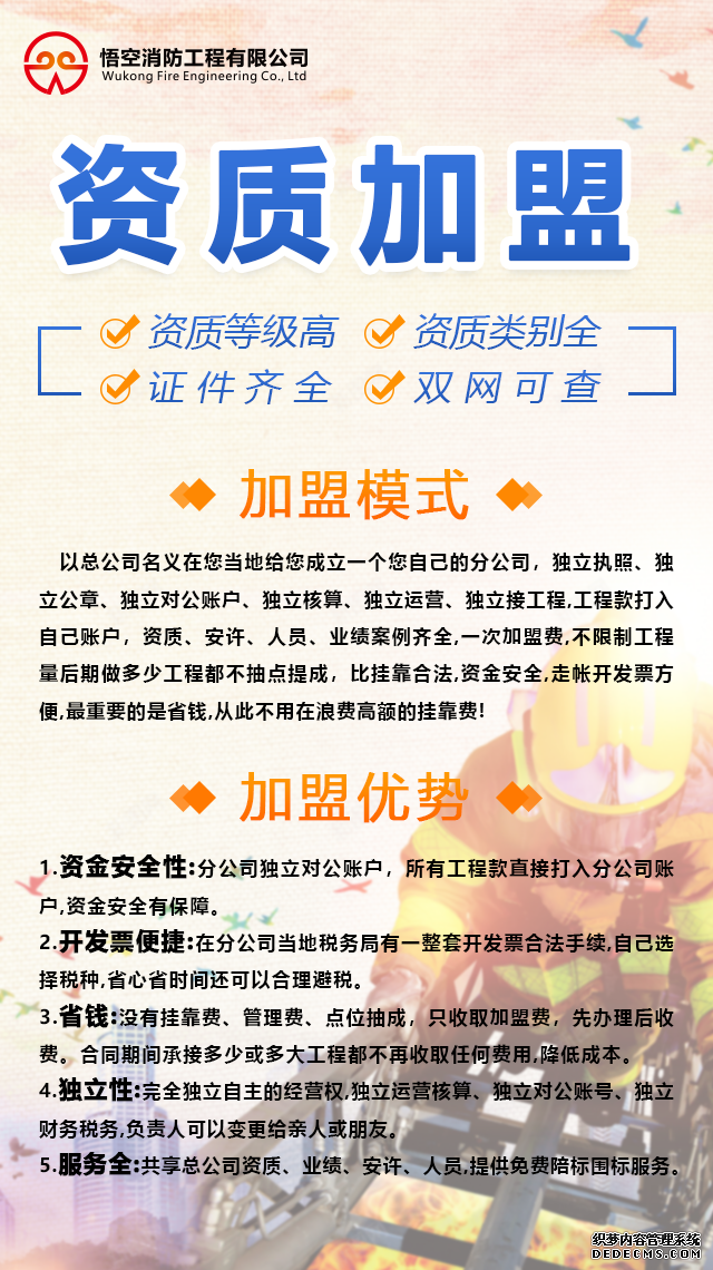 悟空消防工程有限公司專業(yè)消防12年,全國多省備案,資質(zhì)齊全,為您量身打造分公司合作方案,關(guān)于合作成立消防分公司,如果您還有什么疑問,可以隨時聯(lián)系我們。